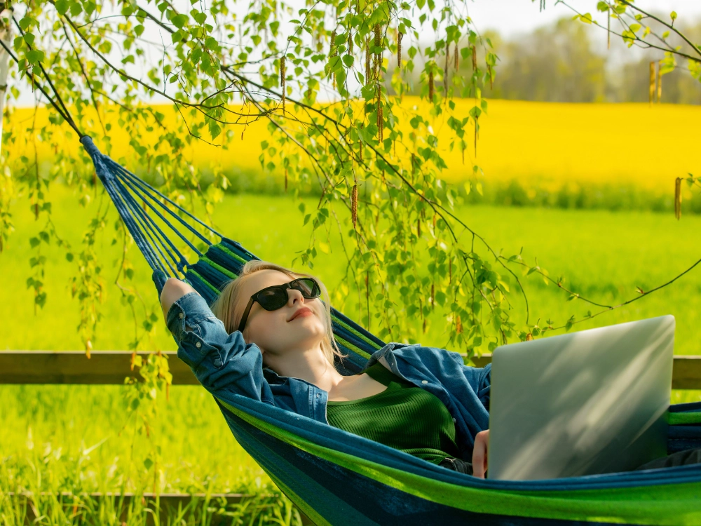 Wzmocnione zakończenia i gęsto plecione sznury równomiernie rozkładają obciążenie, zapewniając bezpieczne i wygodne bujanie.