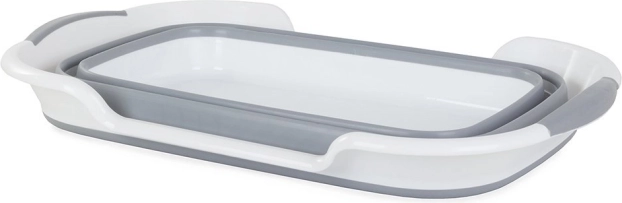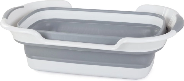 Praktyczna silikonowa składana misa z odpływem, odpowiednia do prania, sprzątania i kempingu. Dzięki wysokości po złożeniu jedynie 7,5 cm oszczędza miejsce, oferuje pojemność ok. 40 l, odpływ z nieprzepuszczalnym korkiem oraz antypoślizgowe uchwyty i nóżki z wytrzymałego tworzywa sztucznego i silikonu.