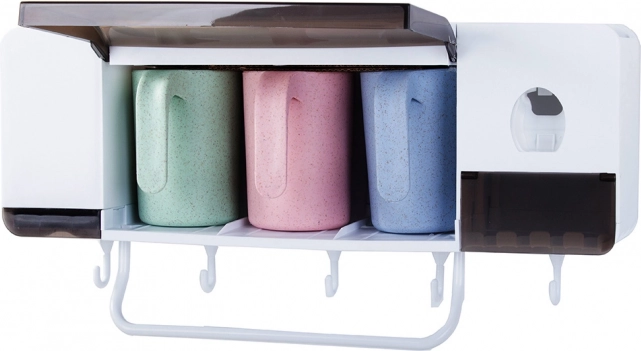 Sprytny organizer do łazienki łączy miejsce na szczoteczki, pastę i kosmetyki w jednym, kompaktowym module. Automatyczny dozownik pasty do zębów ułatwia codzienną higienę, a przegródki na akcesoria mieszczą kremy, pędzle do makijażu czy dezodoranty. Trzy wytrzymałe plastikowe kubki (300 ml) są idealne dla całej rodziny.