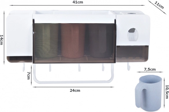 Utrzymaj łazienkę w idealnym porządku dzięki temu ściennemu organizerowi na szczoteczki do zębów i kubki z wbudowanym dozownikiem pasty. Oferuje praktyczne przegródki na kosmetyki, 3 kubki o pojemności 300 ml, haczyki na szczoteczki oraz łatwy montaż na ścianie za pomocą przyssawki. Stabilna konstrukcja o udźwigu do 5 kg i zintegrowany uchwyt na ręczniki zapewniają porządek i oszczędność miejsca.