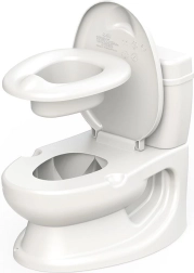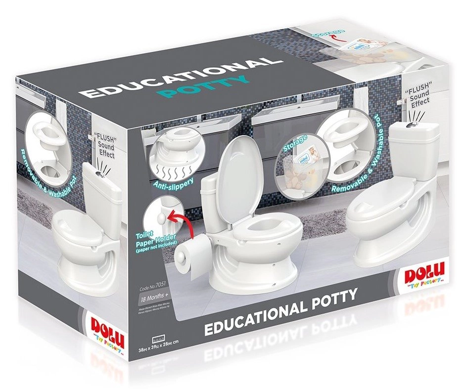 Realistyczny nocnik w kształcie toalety pomaga dzieciom przejść z pieluchy na sedes w zabawny i motywujący sposób. Oferuje dźwięk spłukiwania, uchwyt na papier toaletowy, wyjmowaną misę dla łatwego czyszczenia oraz antypoślizgową podstawę dla bezpiecznego użytkowania.