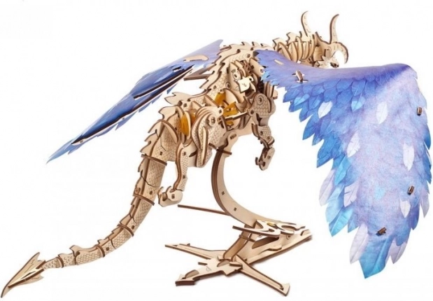 Laserom vyrezané dieliky z preglejky do seba presne zapadajú a vytvárajú realistický model draka s výraznými modrými krídlami, pripravený zažiariť na stojane aj v akcii.