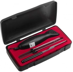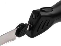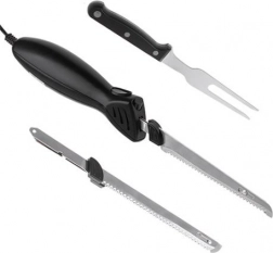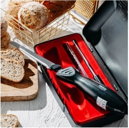 Nôž je vybavený bezpečnostným vypínačom, ktorý zabraňuje náhodnému spusteniu prístroja – kľúčová vlastnosť pre bezpečnosť v kuchyni. Jednoduchá výmena čepelí pomocou dedikovaného tlačidla umožňuje rýchle prispôsobenie sa vašim aktuálnym potrebám. Dĺžka kábla 100 cm zabezpečuje dostatočnú voľnosť pohybu počas práce.
