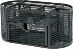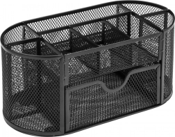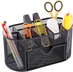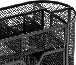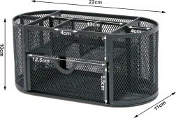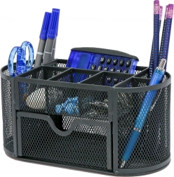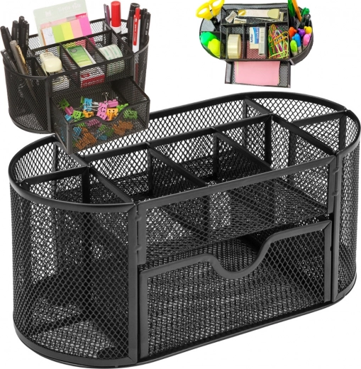 Tento čierny kovový organizér na písací stôl je ideálnym riešením pre uloženie a usporiadanie školských a kancelárskych potrieb. Vďaka ľahkej konštrukcii zo sieťoviny je možné ľahko prehľadne umiestniť perá, nožnice, sponky a ďalšie drobnosti, ktoré potrebujete mať poruke.