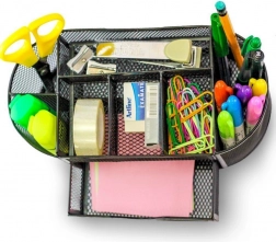Organizér obsahuje četné priehradky a výsuvnú zásuvku, ktoré umožňujú efektívne využiť priestor na pracovisku. Vďaka protišmykovým nožičkám zostane na svojom mieste a zaistí stabilitu. Jeho oválny tvar a moderný dizajn sa hodia do každej pracovne.