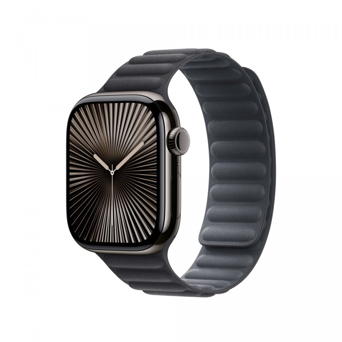 Čierny rebrovaný magnetický remienok, vyrobený z jemnej textílie FineWoven, elegantne obopína vaše zápästie. Špeciálne tvarované magnety zaisťujú, že remienok zostáva pevne a pohodlne upevnený po celý deň.