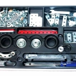 Stavebnica obsahuje 230 kovových dielov vrátane skrutiek, matiek a ďalších komponentov usporiadaných v čiernej priehradke.