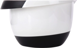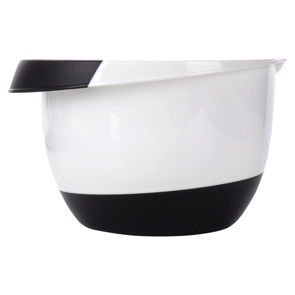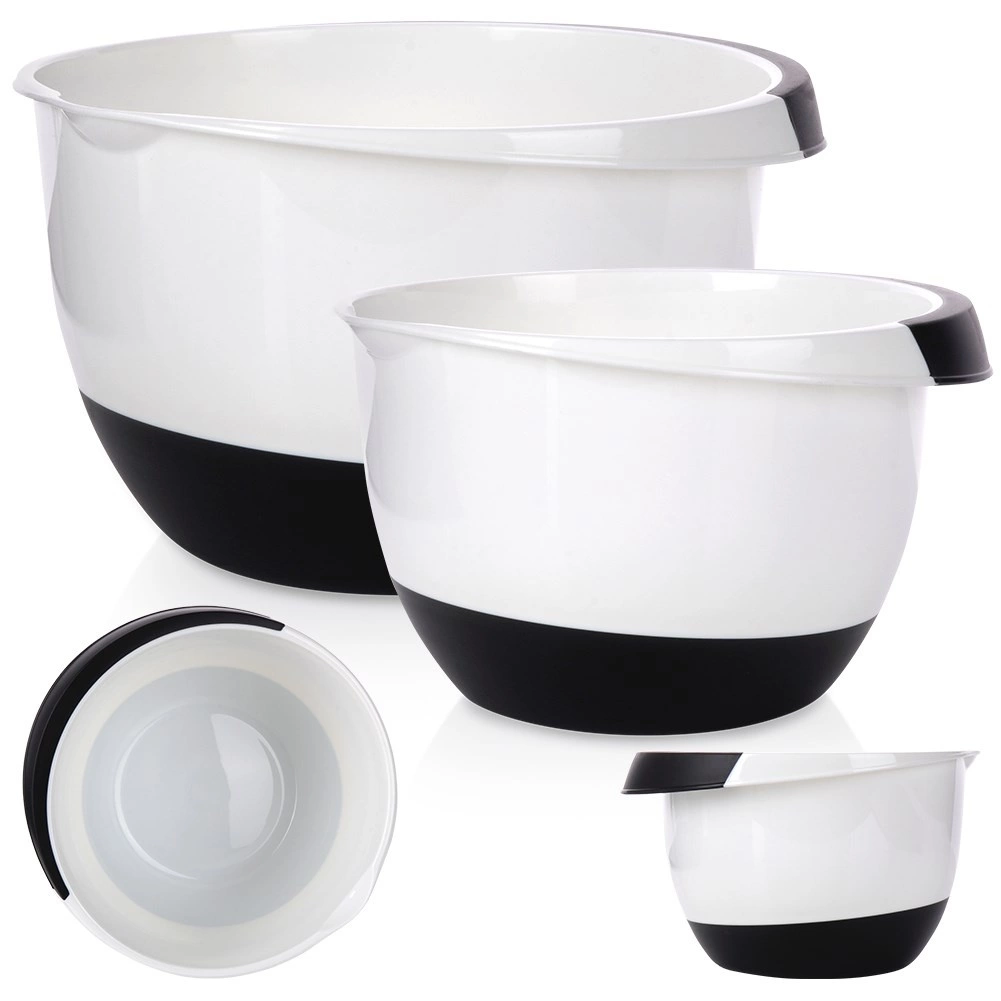Univerzálna sada kuchynských mís v bielej farbe s čiernymi, protišmykovými dnými pre maximálnu stabilitu na pracovnej doske. Vďaka integrovaným úchytom a výlevke je nalievanie ciest či omáčok čisté a presné. Misy sa ľahko udržiavajú, sú ľahučké a zároveň odolné, takže sa hodia na každodenné varenie aj pečenie.