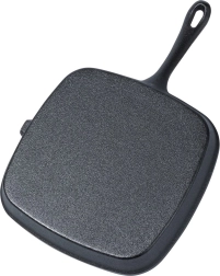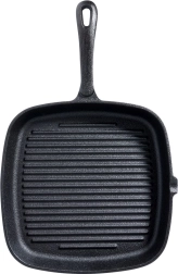 Štvorcová liatinová grilovacia panvica s praktickou červenou silikónovou návlekovou rukoväťou na bezpečné prenášanie. Ponúka rýchle a rovnomerné zohrievanie, vysokú akumuláciu tepla a rebrovaný povrch pre autentické mriežky a odvod tuku. Vhodná na plyn, elektrinu, keramiku, halogén aj indukciu, do rúry aj na otvorený oheň či gril.
