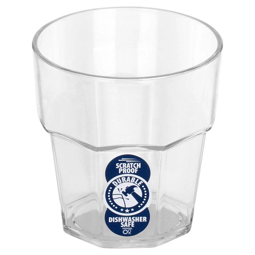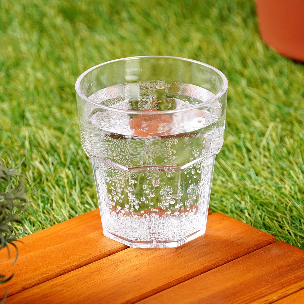 Praktický pohár s objemom 275 ml, s výškou cca 8,5 cm a priemerom 8 cm, je vyrobený z kvalitného číreho akrylu. Ponúka elegantný vzhľad ako sklo, no s výhodou vyššej odolnosti voči rozbitiu. Skvele sa hodí na vodu, limonádu, džúsy, miešané nápoje aj ľadový čaj.