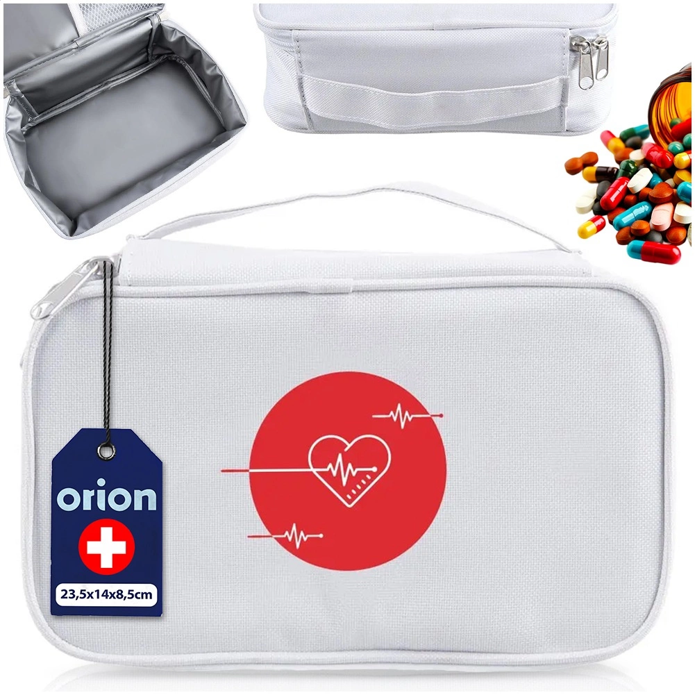 Uchovávajte lieky, sirupy, injekcie aj drobné zdravotnícke pomôcky bezpečne a prehľadne. Termo taška ORION je vyrobená z pevného polyesteru v bielej farbe s červeným motívom srdca a EKG. Termoizolačná výstelka pomáha udržať stabilnú teplotu a chráni obsah pri krátkodobom prenášaní.