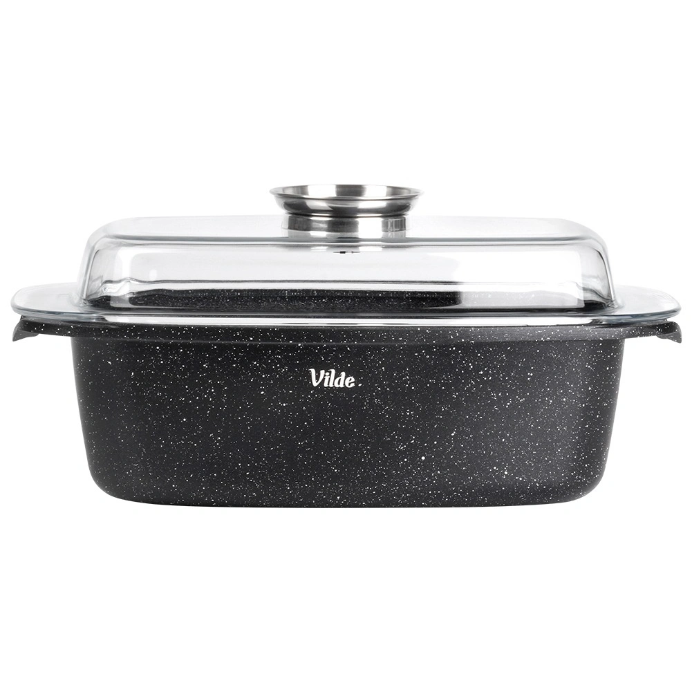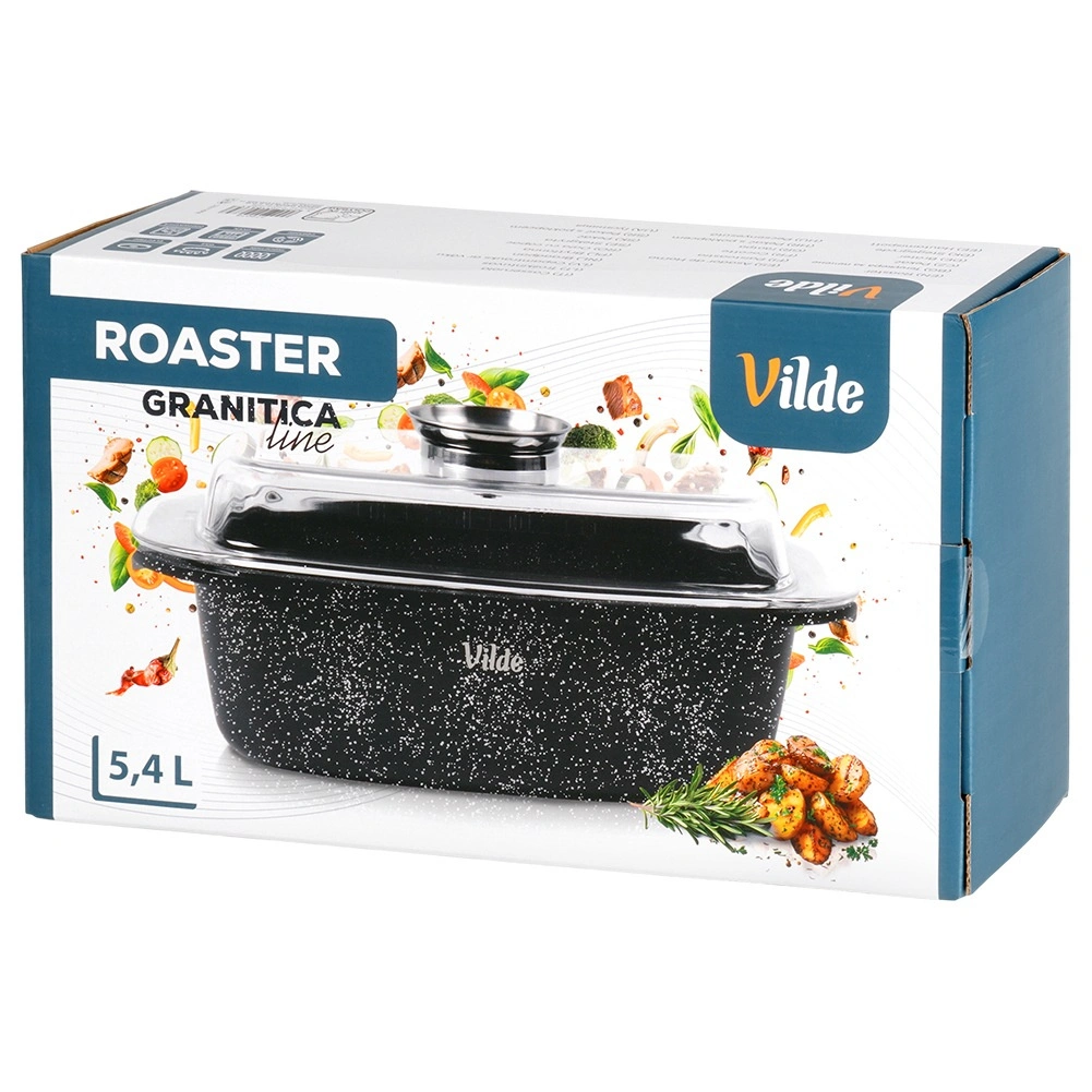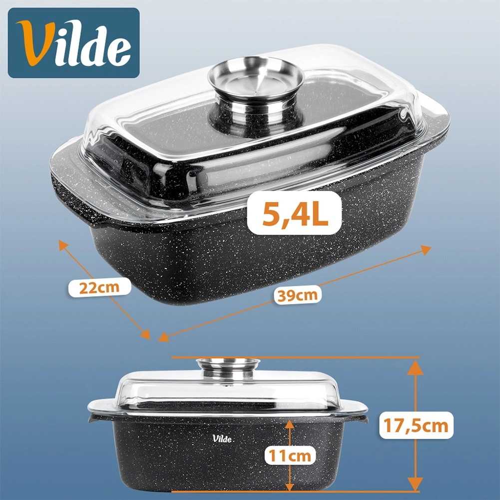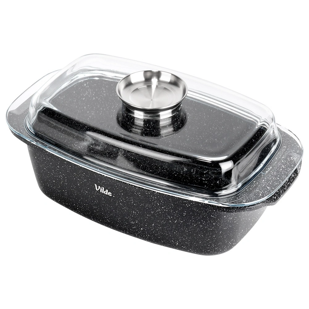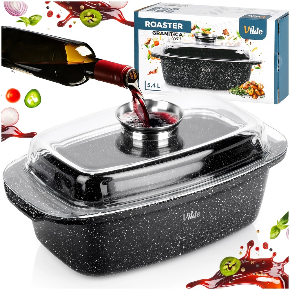 Obdĺžnikový pekáč z odliatku hliníka s odolnou granitovou nepriľnavou vrstvou je všestranným pomocníkom na každodenné varenie. Sklenené veko s centrálnym dávkovačom tekutých prísad umožní dopĺňať vodu, víno či marinádu bez zdvíhania veka – pre šťavnaté a aromatické výsledky.