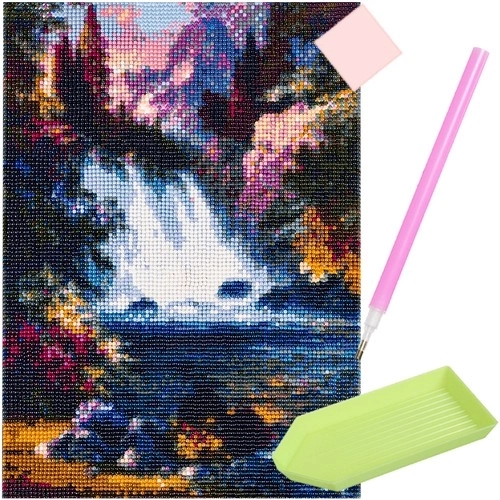Motív vodopádu s rozmerom 30 × 40 cm (plocha obrázka 25 × 35 cm) vynikne trblietavým efektom a po dokončení sa skvele hodí na zarámovanie alebo zavesenie bez rámu. Sada je kompletná – všetko máte ihneď po ruke.