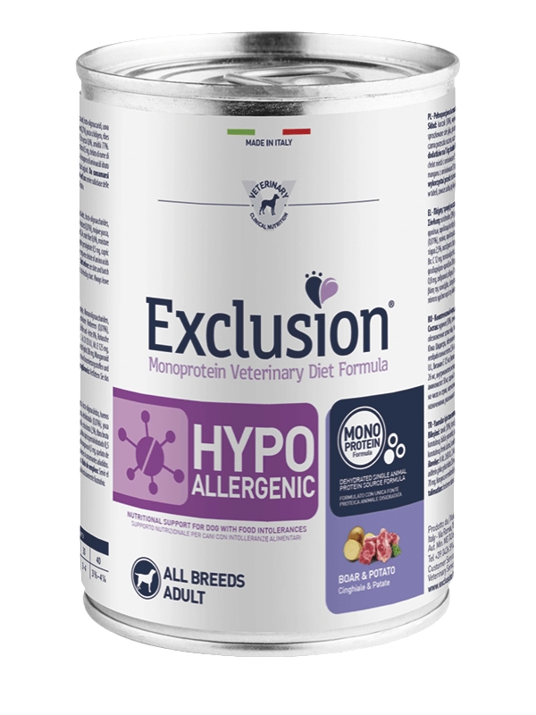Exclusion Hypoallergenic All Breeds Boar & Potato je kompletné diétne krmivo navrhnuté pre psy s citlivým trávením a potravinovými intoleranciami. Jediným zdrojom živočíšnych bielkovín je diviak, sacharidy zabezpečujú zemiaky – ideálna voľba na elimináciu bežných alergénov. Receptúra je bez obilnín a podporuje správne trávenie aj celkovú pohodu psa.