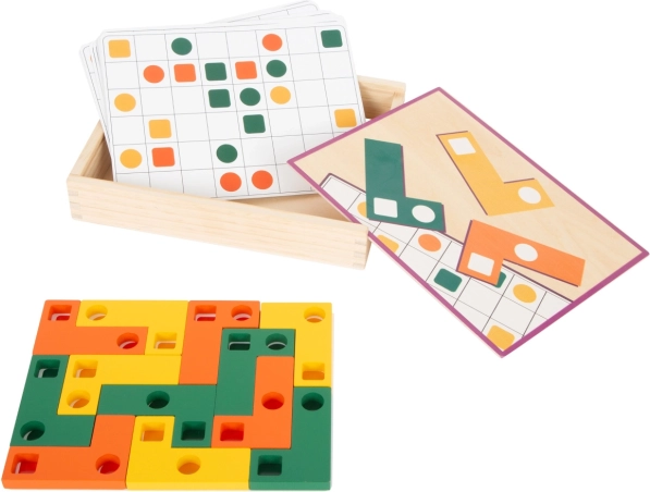Šikovná drevená logická hra pre deti od 4 rokov rozvíja priestorovú predstavivosť, logické myslenie a jemnú motoriku. Pomocou farebných dielikov s otvormi deti skladajú riešenia podľa predlôh na kartičkách a trénujú rozlišovanie farieb a tvarov. Všetko je uložené v odolnej drevenej krabičke s posuvným vekom – ideálne na domáce hranie aj na cesty.