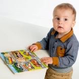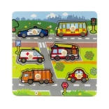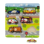 Každý z šiestich vkladajúcich obrázkov predstavuje iný dopravný prostriedok, a to policajné auto, autobus, sanitku, hasičský voz, smetiarske auto a osobné auto. Skladanie je jednoduché vďaka drevenej podložke a úchytkám, ktoré malým ručičkám uľahčia manipuláciu s dielmi.