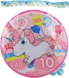 Zábavný detský terč s motívom jednorožca s priemerom cca 35 cm so šiestimi loptičkami na suchý zips pre bezpečné hádzanie. Ideálny na rozvoj motoriky, presnosti a koordinácie oko–ruka u detí od 3 rokov.