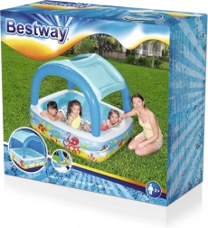 Nafukovací bazén BESTWAY je ideálny pre malé deti vďaka svojmu pevnému vinylovému materiálu a chrániacemu baldachýnu pred slnkom. Užívajte si bezpečnú a zábavnú vodnú hru na záhrade!