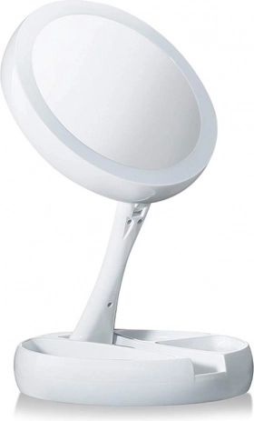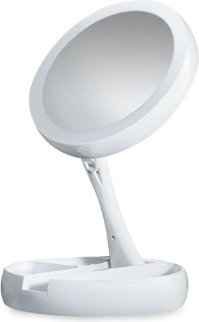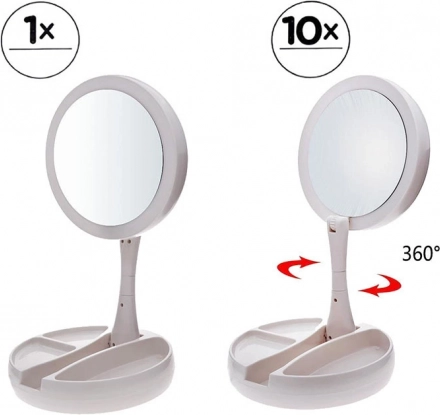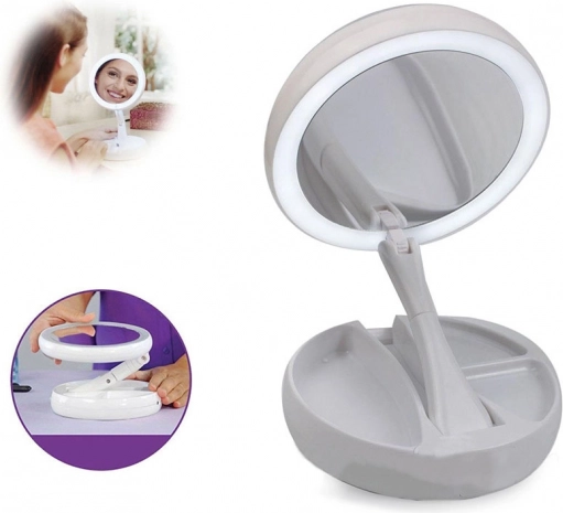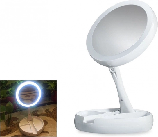 Stabilno stojalo z predalčki za drobnarije poskrbi, da so čopiči, pinceta ali šminka vedno pri roki. Konstrukcija s nagibanjem/vrtenjem za 180° olajša nastavitev idealnega kota. Napajanje je prilagodljivo: baterije 4× AA ali prek 5 V Micro USB – popolno za domačo toaletno mizico in potovanja.