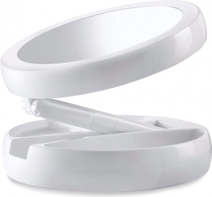 Elegantno okroglo ogledalo z LED-osvetlitvijo zagotavlja enakomerno svetlobo in natančen odsev brez senc. Zaradi dvojne površine imate na voljo običajen prikaz 1× in podrobno 10× povečavo za precizno urejanje obrvi, eyelinerja ali vstavljanje leč. Gumb na dotik na podstavku omogoča hitro vklop osvetlitve.