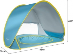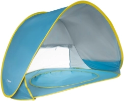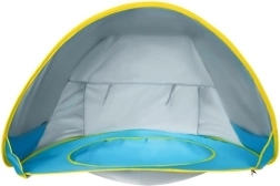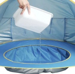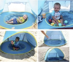 Polodprti POP UP plažni šotor z bazenom je popolna kombinacija senčnika in zagrad z bazenom, vendar je veliko bolj udoben in zavzame veliko manj prostora, kar je pomembno pri pakiranju prtljage. Ščiti pred vetrom in prekomernim soncem. To je pomembno, če se odpravljate na plažo z otroki in jim želite zagotoviti varne počitnice. Bazen je vgrajen v spodnji del šotora. Dovolj je izkopati luknjo, naliti vodo in dojenček se lahko škropi.