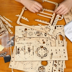 Odkrijte čar mehanike z leseno frnikolsko stezo ROKR Climber – natančen 3D puzzle, ki povezuje lepoto inženirstva, STEM učenje in zabavo za vso družino. Po sestavi le zavrtite ročico in opazujte, kako jeklene kroglice švigajo po spiralnih klancih, skozi stolpni razdelilnik in dvigala v zapletenem sistemu zobnikov.