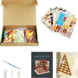 Vse potrebno je vključeno v paketu – od predrezanih delov iz vezane plošče preko papirnatih in tekstilnih elementov do lepila, barv in čopiča. Sestavljanje vključuje barvanje in lepljenje, delo z drobnimi detajli ter potrpežljivo zlaganje, kar ga naredi za idealen projekt za miren vikend.