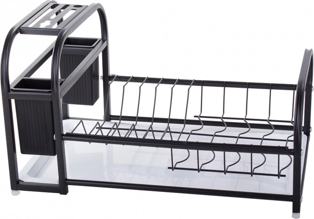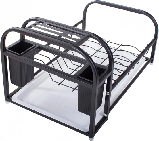 Ta sodoben odkapnik za posodo združuje trdno kovino s prašnim premazom in vzdržljive plastične komponente. Je odporen proti vlagi in poškodbam, zato je idealen za vsakodnevno uporabo v živahni kuhinji. Loft dizajn v elegantni črni barvi se zlahka ujema z vsakim interierjem in postane funkcionalen okras delovne površine.