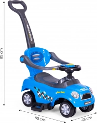 Odličen otroški poganjalec 3v1 v modri barvi z varnostnimi stranskimi ovirami in opcijskim ročajem za starše. Idealno za otroke od 3. leta starosti, ponuja zabavno in razvijajočo vožnjo z multimedialnim volanom in shranjevalnim prostorom pod sedežem.