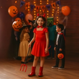 Stajliš hudičev kostum v živo rdeči barvi v hipu preobrazi tako otroke kot odrasle. Zahvaljujoč mehkim materialom in prožnim pritrdilom se dodatki zlahka namestijo in prijetno držijo ves čas zabave. Komplet je idealen za domačo igro vlog, šolske prireditve, fotografiranje in večerne zabave.