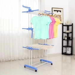 Odkrijte praktičnost modernega modrega zložljivega sušilnika za perilo, ki ponuja veliko kapaciteto z tremi zložljivimi ravnmi, enim spodnjim regalom in dvema rokama za obešalnike. Sušilnik je zelo stabilen in izdelan iz kakovostnih materialov, kar omogoča nosilnost do 20 kg oblačil.