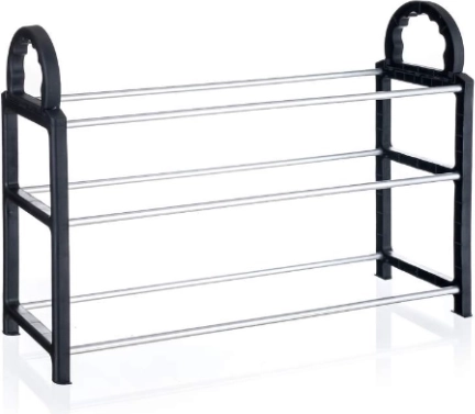 Praktična čevljarna polica, idealna za učinkovito shranjevanje čevljev, izdelana iz kromiranih cevi in črnega plastičnega materiala. Primerna je tudi za notranje prostore garderob.