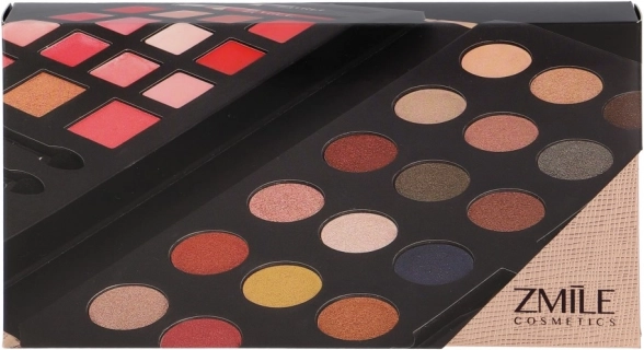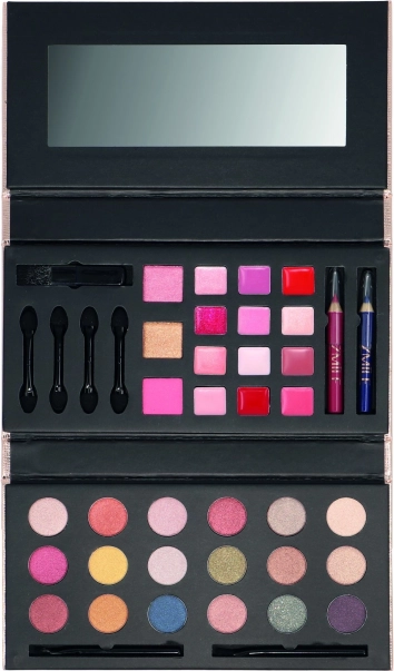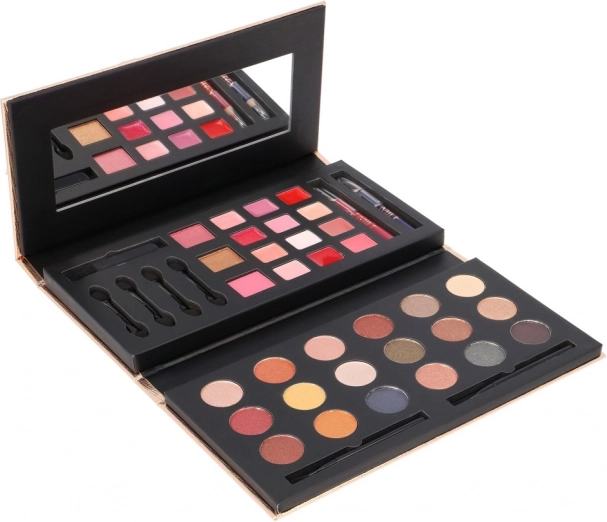 Zložljiva kozmetična paleta »Glam To Go« – v dveh nadstropjih vsebuje 18× senčil za oči, 12× kremasto šminko, rdečilo za lica, bronzerni puder, 1× črtalo za oči, 1× svinčnik za ustnice, 1× aplikator in vgrajeno ogledalce. Dermatološko testirano, ustreza strogim standardom EU.