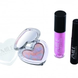 Troje izdelkov – senčila za oči v srčasti paletki, glos za ustnice in maskara – tvorijo praktičen set za vsakodnevni in večerni make-up.