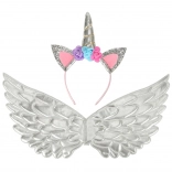 Ta čudovit kostum omogoča, da svojega otroka spremenite v edinstvenega samoroga. Sestavljen je iz srebrnega krila, elegantnih kril in natančno izdelanega naglavnega traku z rožicami. Idealen za vsako priložnost, ko si otrok lahko privošči pravljično igro.
