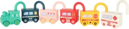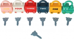 Vsako vozilo ima izrazito barvo in število koles za preprosto ujemanje z oštevilčenimi ključi. Otroci si naravno osvajajo barve, štetje in razvrščanje.