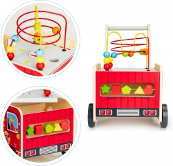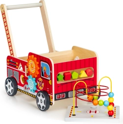 Lesena hojica v obliki gasilskega avta je idealen pomočnik za prve korake vašega otroka. Hojica je zasnovana tako, da zagotavlja stabilnost in hkrati zabavo s pomočjo različnih interaktivnih elementov kot so zobniki, labirinti z kroglicami in sortirnik oblik.