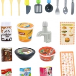 Bogata zbirka 42 elementov vključuje lonec s pokrovko, ponev, kuhinjski pribor, krožnike, skodelico, sadje in zelenjavo, ribo, piščanca, raka, jajca, embalažo »mleka«, »kečapa«, škatlice od sladoleda in drugo. Vse je iz kakovostne plastike in kartona, brez ostrih robov za varno igro. Kuhinjica podpira igre vlog, uči osnov kuhanja in reda.