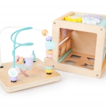 Vsaka stran kocke ponuja različne igralne elemente, kot so labirint, drsne sestavljanke ali vrtljiva zobnika, ki podpirajo otrokove motorične in kognitivne spretnosti.