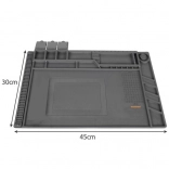 Podloga je odporna na visoke temperature, zato zanesljivo zaščiti delovno mizo pri spajkanju ali delu z vročim zrakom. Integrirane merilne črte v cm in palcih olajšajo natančno merjenje in postavitev komponent. Silikon je obenem odporen na kemikalije in enostaven za čiščenje.