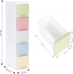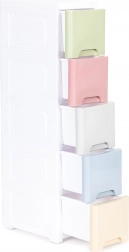 Praktična otroška polična omara ModernHome s 5 barvnimi predali in kolesci za enostavno premikanje je idealna za otroško sobo in kopalnico. Varnostni zatiči preprečujejo izpadanje predalov, čvrsta plastična konstrukcija in moderen bel okvir pa zagotavljata vzdržljivost in čist videz.