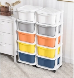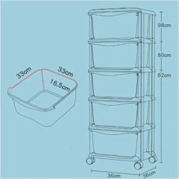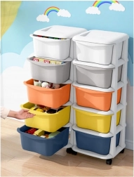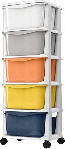 Pospravite igrače, kozmetiko in drobnarije pregledno na enem mestu. Premična polica z belim ogrodjem in petimi barvnimi zabojniki ponuja moderen videz, enostaven dostop in stabilno izvedbo za dom, pisarno ali kopalnico.