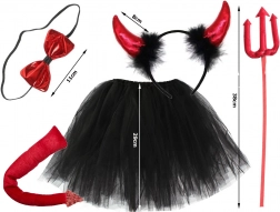 Naš komplet hudičevskega kostuma za deklice vsako malo princeso spremeni v prikupno hudičevko. Idealen za noč čarovnic, ta kostum vključuje vse potrebne dodatke za popoln videz in zabaven večer. Vsebina: črno krilo, rdeč hudičev trizob, rožički na naglavnem obroču, metuljček za okoli vratu in stilski rep.