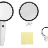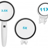 Praktična ročna lupa z ergonomsko držalo in 2x LED osvetlitvijo za jasen in udoben pogled na detajle. V paketu najdete 3 zamenljive leče z povečavo 3,5x, 5x in 11x, idealne za branje, numizmatiko, nakit in natančna domača opravila. Napajanje zagotavljajo baterije 3× LR44 (priložene).