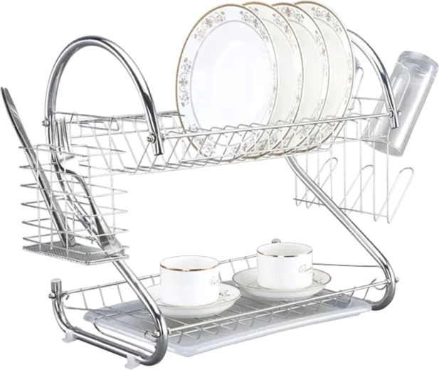 Kromiran dvonivojski sušilnik za posodo in pribor z odcejalnikom. Zgornja polica zlahka sprejme do 15 krožnikov. Na spodnji polici lahko pregledno uredite kozarce in skodelice. Izjemno prostoren in nepogrešljiv dodatek vsake kuhinje! V njem je prostor za vso vašo posodo in pribor! Zaradi svojih kompaktnih mer ga zlahka pospravite v kuhinjsko omarico! Ima vrsto dodatnih, odstranljivih elementov, npr. plastični pladenj za zajemanje vode, dodatni odcejalnik za pribor in zunanji nosilec za do 6 kozarcev. Gre za pravi kuhinjski kombinator, ki učinkovito uredi vse komplete posode v vaši kuhinji!
