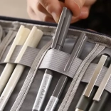 V notranjosti najdete 6 mrežastih žepov za hiter pregled in 8 elastičnih trakov za trdno pritrditev dodatkov. Zapiranje na zadrgo varuje vsebino, penasta podloga blaži udarce, pašček za zapestje pa olajša prenašanje. Primerno za delo, študij in potovanja.