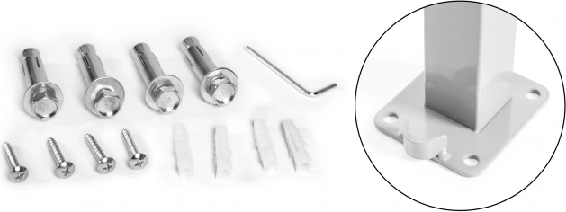 Montaža tende je enostavna in hitra, kar omogoča lahkotno namestitev brez posebnih veščin ali orodja.Dva stebrička je mogoče preprosto pritrditi na steno in na tla za večjo stabilnost in varnost z vključeno montažno opremo.