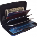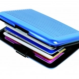 Zunanja plast je izdelana iz aluminija, ki preprečuje nezaželeno skeniranje čipov. Notranji, pahljačasti prostor s 6 predelki zagotavlja popoln red za kartice in vizitke. Enostavno odpiranje in zapiranje omogoča praktičen gumb.