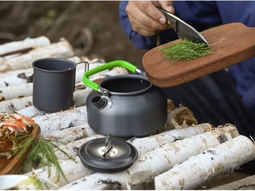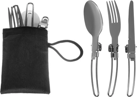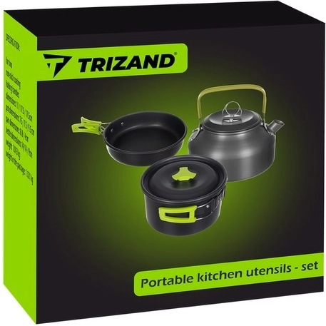 - Popolna oprema – lonec, ponev, čajnik s pokrovom, univerzalni pokrov, 2x nož, 2x vilica, 2x žlica, 2x karabin, 2x zložljiv kozarček, 2x etui za pribor, transportna vrečka.