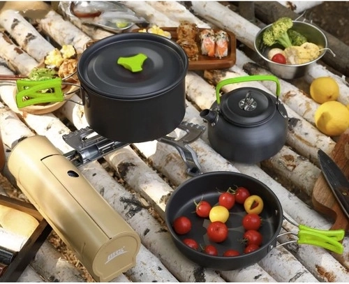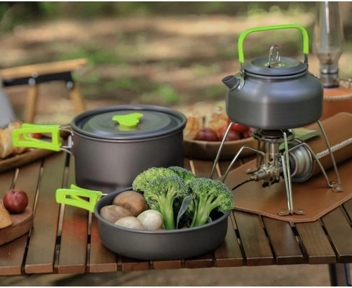 Kompakten kamping set posode za 2 osebi z neprijemljivo površino in zložljivimi ročaji. Vsebuje lonec, ponev, čajnik, zložljiv jedilni pribor, zložljive kozarčke in praktičen transportni vrečkast nahrbtnik. Idealno za kampiranje, pohodništvo in kuhanje na prostem.